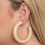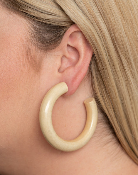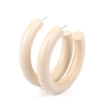 Painted in a neutral white finish, a thick wooden frame dramatically curls into an oversized hoop for a colorfully retro look. Earring attaches to a standard post fitting. Hoop measure approximately 2 1/2" in diameter.