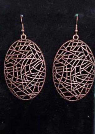 Brushed in an antiqued finish, textured copper bars crisscross across the front of an oval frame, creating a shattered pattern. Earring attaches to a standard fishhook fitting.