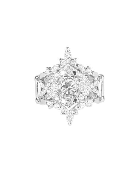 Dotted in glassy white rhinestones, dainty silver bands and flirty heart-shaped silver frames weave around a timeless white rhinestone center, creating a regally layered centerpiece atop the finger. Features a stretchy band for a flexible fit.