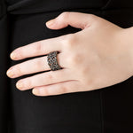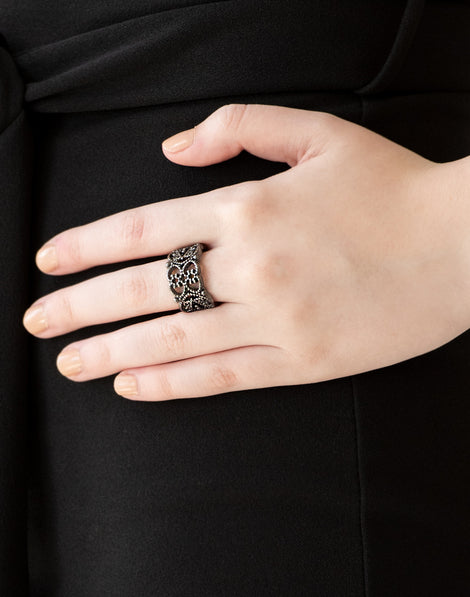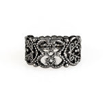 Brushed in an antiqued shimmer, dotted gunmetal filigree whirls across the finger, creating a frilly band. Features a stretchy band for a flexible fit.