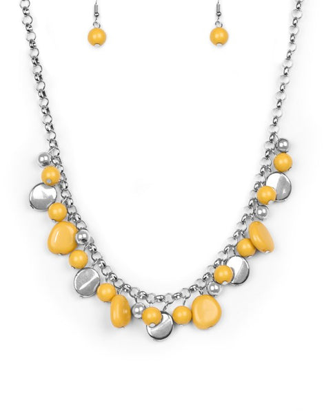 Featuring round and asymmetrical shapes, shiny silver and yellow beads swing from the bottom of a bold silver chain, creating a flirtatious fringe below the collar. Features an adjustable clasp closure.