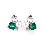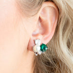 Featuring a classic pearl, mismatched green and white rhinestones join into a radiant frame. Earring attaches to a standard clip-on fitting.