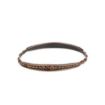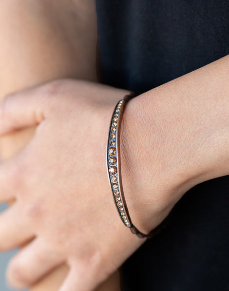 Gradually increasing in size at the center, two sections of topaz rhinestones are encrusted along a dainty copper bangle rippling with wavy textures for a timeless twist.