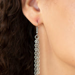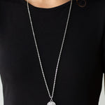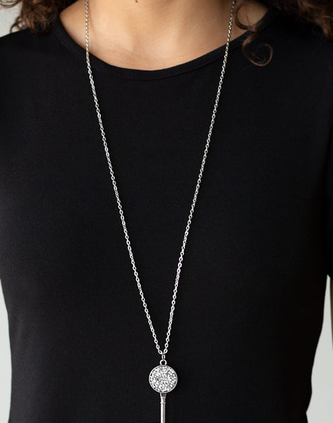 Encrusted in glassy white and glittery hematite rhinestones, a sparkling silver key swings from the bottom of a lengthened silver chain for a whimsical look. Features an adjustable clasp closure.