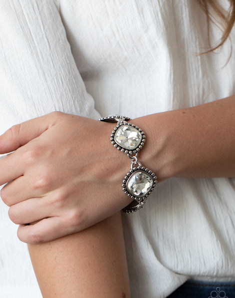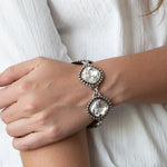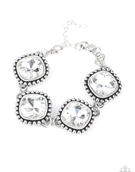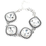 Featuring dramatically studded silver frames, an exaggerated display of oversized white rhinestone encrusted frames delicately link around the wrist for a blinding look. Features an adjustable clasp closure.