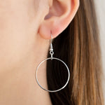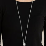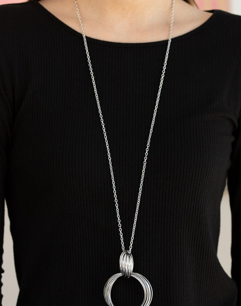 A collection of large and small shiny silver rings interlock into a bold pendant at the bottom of a lengthened silver chain. Features an adjustable clasp closure.