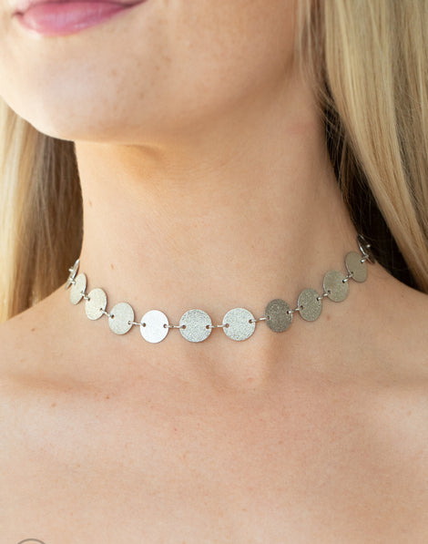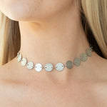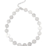 Hammered in shimmery detail, a shiny collection of dainty silver discs delicately link into a blinding display around the neck. Features an adjustable clasp closure.
