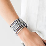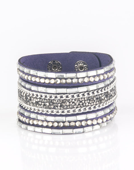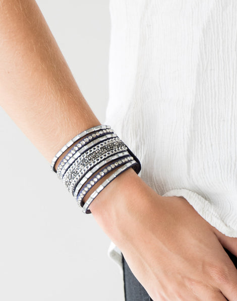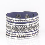 White emerald-cut rhinestones, smoky round rhinestones, and metallic prism-shaped rhinestones are sprinkled along strands of blue suede. Shimmery silver chain is added to the mix for a sassy industrial finish. Features an adjustable snap closure.