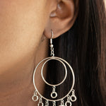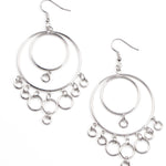 A dainty collection of silver rings swing from the bottom of interconnected silver hoops, creating a dizzying fringe. Earring attaches to a standard fishhook fitting.