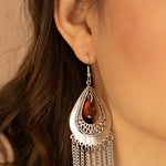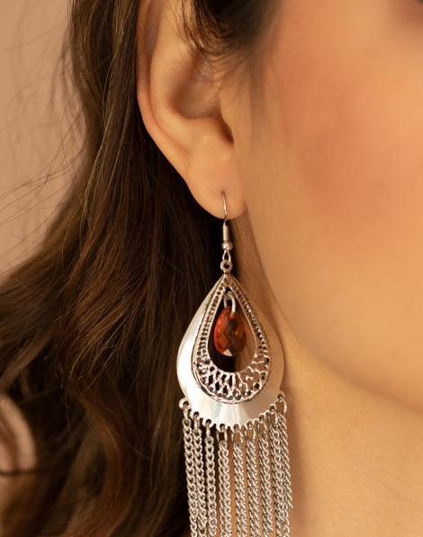 A faceted orange teardrop dangles from the top of a decorative silver teardrop frame featuring stenciled and hammered details. Dainty silver chains stream from the bottom, adding a classic fringe to the refined display. Earring attaches to a standard fishhook fitting.