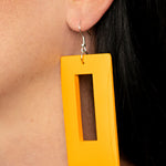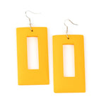 Brushed in a sunny yellow finish, a thick rectangular wooden frame swings from the ear for a retro look. Earring attaches to a standard fishhook fitting.
