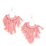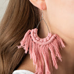 Tassels of Rose Tan thread decoratively knot at the bottom of a shiny silver teardrop, creating an earthy fringe. Earring attaches to a standard fishhook fitting. Sold as one pair of earrings.